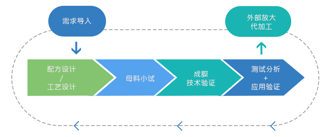 在薄膜成型過程中,加入各類功能母料,會在薄膜上表現(xiàn)出新的特性,使薄膜產(chǎn)品滿足不同應(yīng)用需求。功能母料研發(fā)與中試驗(yàn)證中心旨在通過獨(dú)特的配方設(shè)計(jì)模型及功能材料分散技術(shù),建設(shè)兩個方面的能力:根據(jù)薄膜功能要求設(shè)計(jì)母料并驗(yàn)證中試;根據(jù)基礎(chǔ)功能材料性能,設(shè)計(jì)新型母粒,開拓新的應(yīng)用。