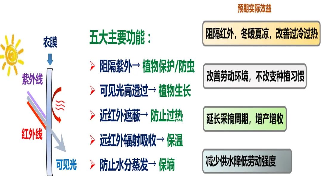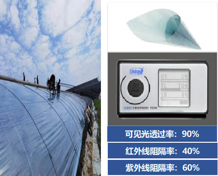 擇光增產(chǎn)大棚膜,一款具有對(duì)太陽(yáng)光的選擇性透過功能,可以在確保大棚可見光高透過的前提下,高效阻隔不參與作物光合作用的紫外、紅外光,實(shí)現(xiàn)大棚零能耗被動(dòng)控溫(冬暖夏涼),夏日“遮陽(yáng)”,冬天“保暖”的農(nóng)用調(diào)光膜。可應(yīng)用于農(nóng)作物蔬果、花卉、多肉、中草藥等溫室種植,延長(zhǎng)作物采摘期,拓展作物種植的種類和季節(jié)限制,改善勞作環(huán)境,延長(zhǎng)夏季“可”勞作時(shí)間;應(yīng)用于水產(chǎn)、家禽等養(yǎng)殖,提供更為舒適的養(yǎng)殖環(huán)境,節(jié)能減排。