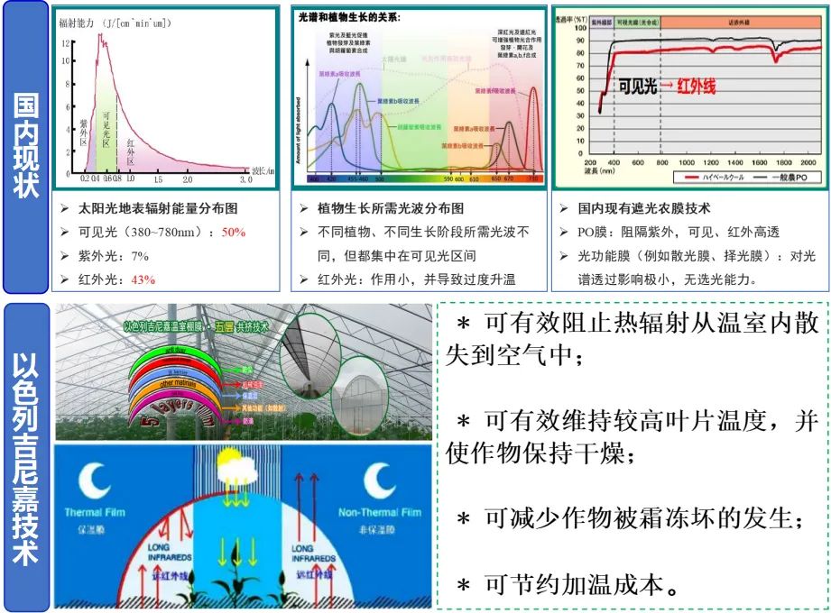 夏季高溫灼傷及冬季凍死凍傷問題的根源在于地表日光輻射分布與農(nóng)作物生長(zhǎng)所需光波不匹配,現(xiàn)有農(nóng)業(yè)技術(shù)無(wú)法高效發(fā)揮太陽(yáng)光的“光熱”作用。目前,國(guó)內(nèi)無(wú)相關(guān)有效解決方案,而國(guó)外已經(jīng)意識(shí)到該問題,提出組合型光功能農(nóng)膜方案!