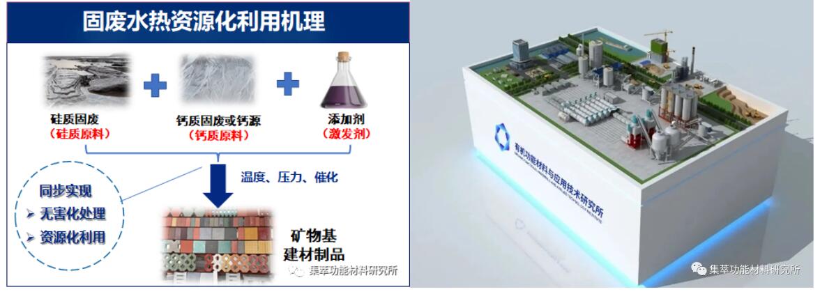 面對我國固廢處置行業(yè)普遍存在的資源化手段粗放單一、處理效率低下、資源化產(chǎn)品附加值低等問題,同萃和科技依托有機(jī)功能材料與應(yīng)用技術(shù)研究所核心專家團(tuán)隊自主研發(fā)的水熱固化技術(shù),通過模擬自然地質(zhì)成巖機(jī)理,在工業(yè)條件下促使固廢原料中的元素成巖轉(zhuǎn)變,同時添加核心藥劑合成目標(biāo)礦物,協(xié)同固化其中污染物并提升材料強(qiáng)度,最終制備得到高強(qiáng)度、低環(huán)境負(fù)荷的固廢再生功能建材產(chǎn)品,可廣泛應(yīng)用于建筑、市政、水利等多領(lǐng)域。目前已開發(fā)出固廢高效水熱資源化成套裝備和專用藥劑,形成了重污染/高含水率無機(jī)固體廢棄物的高值無害水熱資源化利用綜合解決方案。該解決方案實(shí)現(xiàn)大宗固廢高效處置的同時,也實(shí)現(xiàn)了固廢資源化產(chǎn)品從原料端到應(yīng)用端的全生命周期低碳減排。