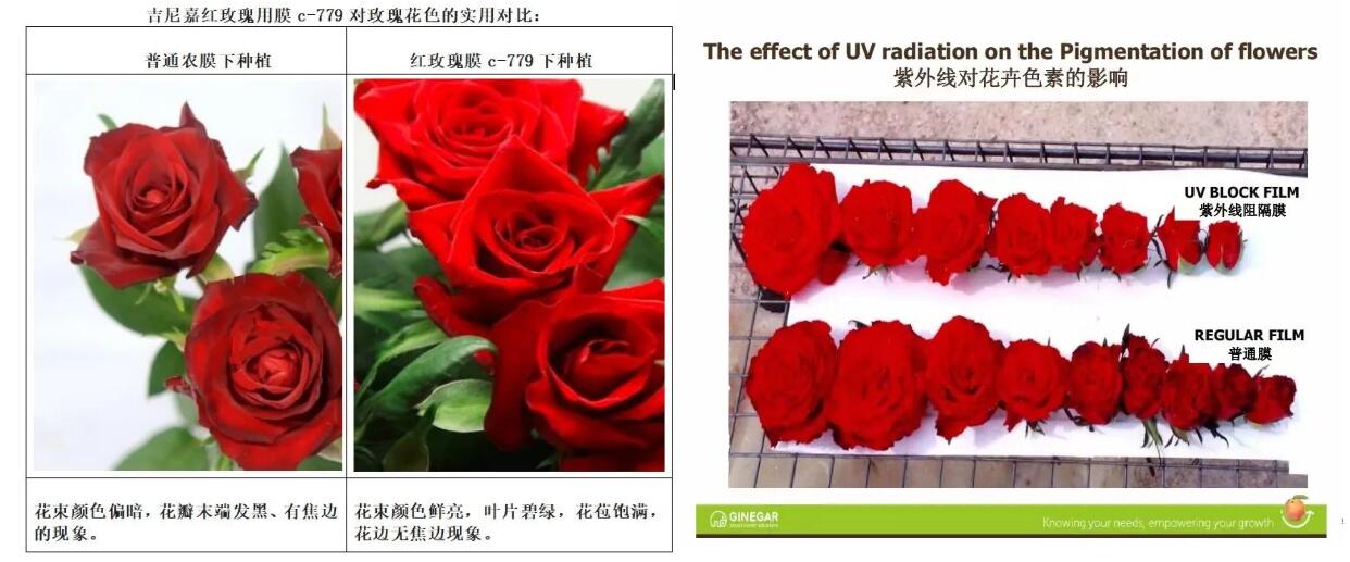 以色列吉尼嘉(Ginegar)塑料制品有限公司作為以色列乃至全球最大的農膜制造商,成功利用光學控制薄膜技術,針對云南緯度低、海拔高高原地區(qū)太陽光中存在的過強的紫外線照射使得在紅玫瑰種植中極易出現“黑邊”問題,開發(fā)出具有紫外阻隔特殊功能紅玫瑰專用功能棚膜,獲得長勢更好、花色更正、枝條葉片更鮮嫩的紅色玫瑰花。