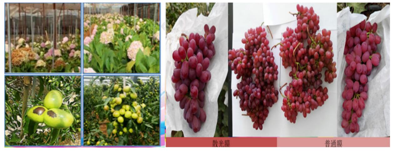 通過在棚膜基體樹脂中添加散光劑達到散光目的,使透過棚膜的光線在棚膜的內部或表面發(fā)生漫反射作用,使得棚內作物受光更均勻,減少夏日局部高溫的光合作用效率更高,著色更好,成熟時間更早;且陽光強烈時,可有效降低棚內溫度,防止作物灼傷。