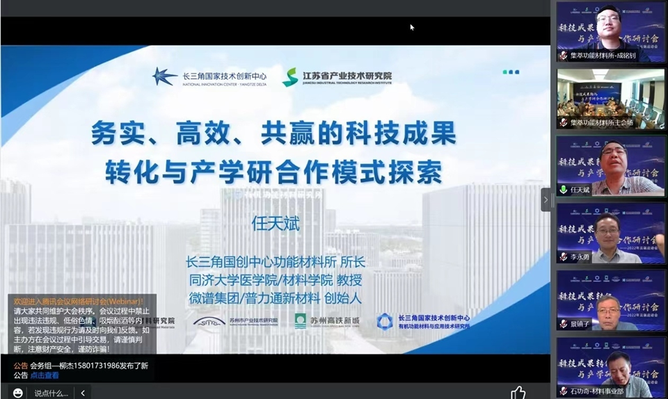 本次云端專題研討會(huì)是功能材料所的一次重要嘗試,旨在探索科技成果轉(zhuǎn)化和產(chǎn)學(xué)研合作的新模式、新路徑,跨越科技成果轉(zhuǎn)化“死亡之谷”,探討高校、科研院所、企業(yè)之間建立務(wù)實(shí)、高效、共贏的合作模式。