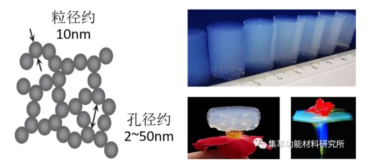 氣凝膠是由納米粒子相互連接形成具有三維網(wǎng)狀多孔結(jié)構(gòu)的固體材料,孔隙率高達90%以上,通常外觀呈藍色,亦稱為“藍煙”。氣凝膠是目前除真空絕熱板外已知的導(dǎo)熱系數(shù)最低(~0.012W/(mK))、密度最低(~3kg/m3)的固體材料。氣凝膠擁有超長的使用壽命、超強的隔熱性能、超高的耐火性能等,被譽為“改變世界的神奇材料”。