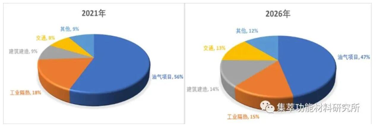 近些年我國氣凝膠產(chǎn)業(yè)技術(shù)進步顯著,產(chǎn)量快速躍升,已成為全球氣凝膠需求大國之一。2015~2020年國內(nèi)氣凝膠材料產(chǎn)量年均復(fù)合增速為38.5%、氣凝膠制品產(chǎn)量年均復(fù)合增速為38.8%。根據(jù)IDTechEX報告,目前氣凝膠應(yīng)用市場有 56%來自油氣項目,18%用于工業(yè)隔熱,9%用于建筑建造,8%用于交通。而到 2026 年,將有 14%用于建筑,而交通領(lǐng)域的需求將增至 13%。